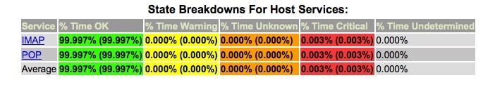 But what is more important is to ensure that not only the server is up but the services that the server provides are up, in this case, it is a mail server providing POP3 and IMAP4 services. In the last six months, we have achieved almost 99.999% uptime. That means less than five minutes of downtime in a year which translates to less than 26 seconds of downtime a month!